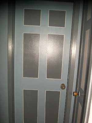 My step four was taping off my panels and painting the panels themselves the lightest color because I wanted a white trim around my darkest color, I didn't want to have to primer over my painted door and then paint white or make the white dull by painting straight over my door color.